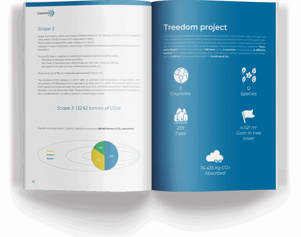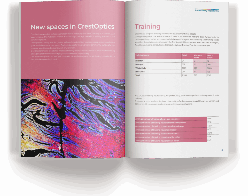 Dal 2023 accompagniamo CrestOptics nel percorso di rendicontazione attraverso il Bilancio di Sostenibilità, contribuendo a migliorare anno dopo anno la qualità dei dati e la riflessione strategica.
