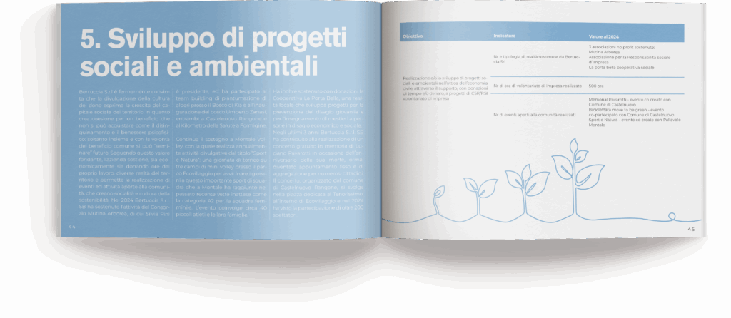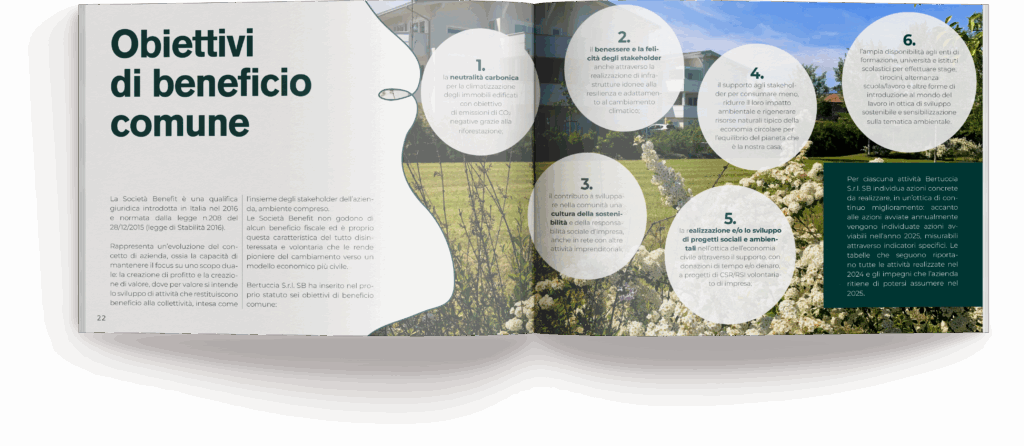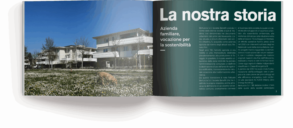 Abbiamo realizzato l’edizione 2024 del Bilancio di sostenibilità e Relazione di Impatto di Bertuccia s.r.l. Società Benefit, la società che sta sviluppando l’Ecovillaggio di Montale Rangone a Modena. L’obiettivo è quello di evidenziare gli impatti sul territorio dei progetti realizzati sottolineando i risparmi energetici, il rispetto dell’ecosistema e il benessere degli abitanti del quartiere. Essendo Bertuccia s.r.l una società benefit, all’interno del documento è stata redatta anche la Relazione d’impatto, per rendicontare le modalità di raggiungimento degli obiettivi di beneficio comune che l’azienda si è posta.