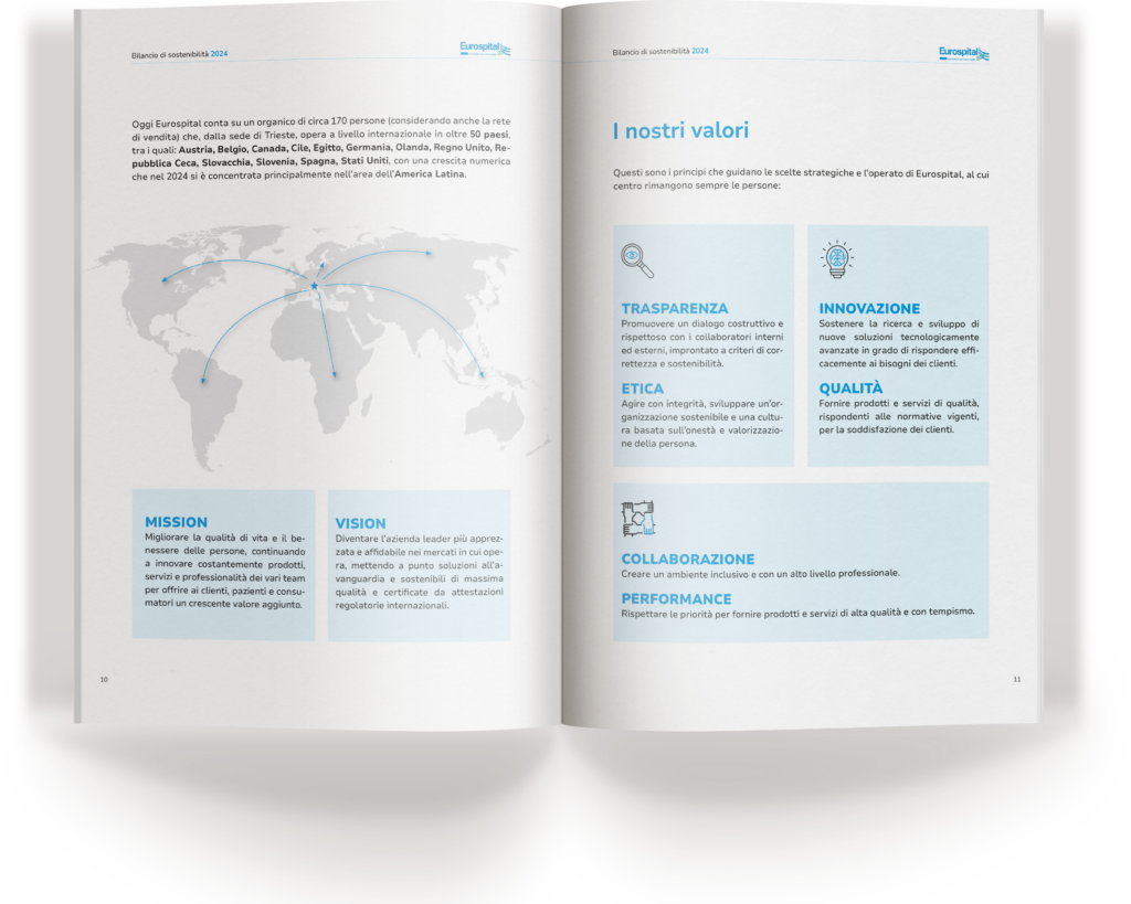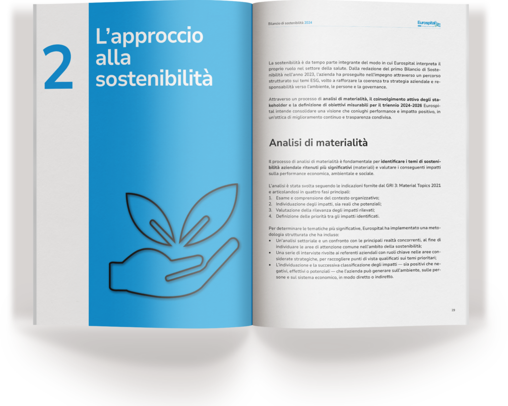 Nel 2025 abbiamo affiancato Eurospital nella redazione del terzo Bilancio di Sostenibilità, costruito in continuità con i documenti precedenti e redatto secondo gli standard GRI.